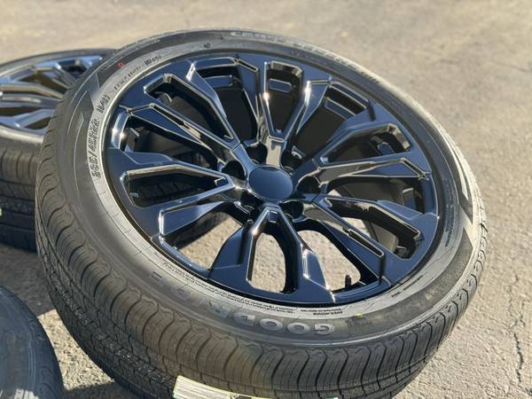 Set of 4 Wheels and Tires, NEW 22” Wheels for Chevy and GMC Trucks and SUVs GMC style Denali Black finish wrapped in New tires size 285/45R22 All Season tire.