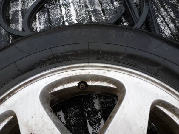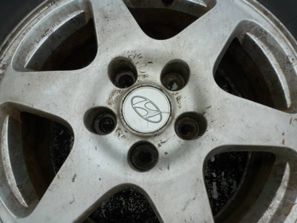 Hyundai aluminum wheel and Prime Well steel belted radial tire 215/60/R16. Used - outer part of rim on the inside has been scraped. Two stud holes look a bit worn. Inflated to 33 PSI and holds air. Could use some TLC. Text is best call to talk. Thanks.