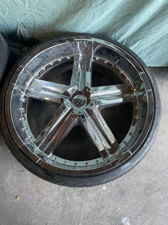 24-in. Chrome wheels with New Pirelli Zero Nero tires. Set of 4. 275/25/ZR24. 5 on 5 and 5 on 5 1/2 bolt pattern. Tires alone would cost you. $350 each plus tax, mount and balance. Asking $1400. Phone calls only. 6-thirty-25-eight-thirteen-24. No texts or emails, they will not be answered.