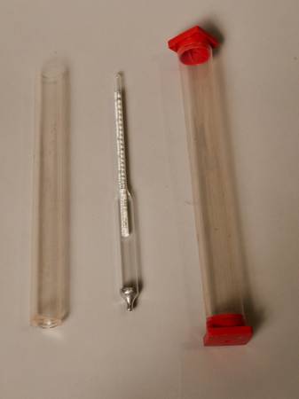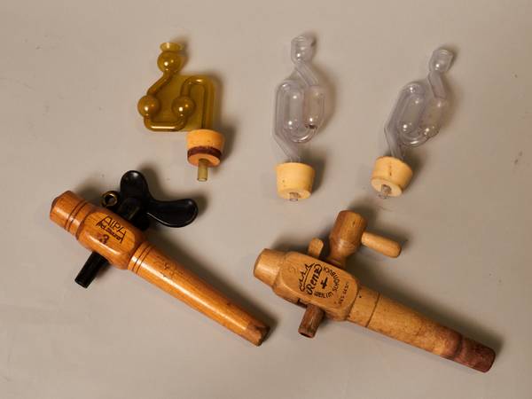 Various equipment for making wine. Corking tool Water valves Barrel valves Hydrometer to measure sugar and alcohol Funnels with filters - 8 in. & 5 in. 5 gallon bottles - qty. 3