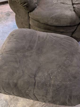 Giving away this cozy oversized chair and ottoman. It's been stored in our basement during construction projects and the fabric needs a good surface cleaning, but that's why it's free! Most recently in a pet-free and smoke-free household, but I got it at the thrift store so couldn't tell you its origins before that.