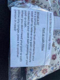 If you have breast cancer, cancer, or a port in your neck, this is a small pillow that attaches to the seatbelt in your car and prevents the seatbelt from irritation/contact/etc. This was gifted to...